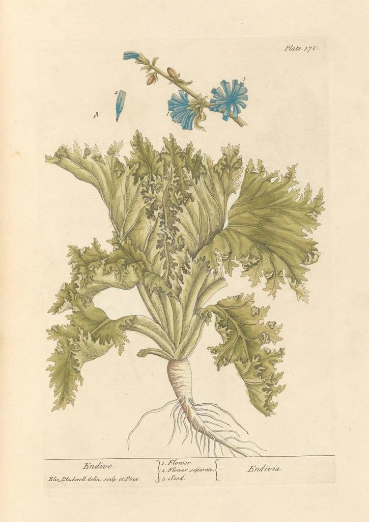 L'œuvre "Endive" av Elizabeth Blackwell är en botanisk illustration som fångar den delikata skönheten hos denna ätbara växt. Med noggranna detaljer framhäver Blackwell nyanser av grönt och vitt som kännetecknar endiven, samtidigt som hon leker med ljuset för att ge liv åt denna avbildning. Tekniken med koppargravyr, som används av konstnären, möjliggör att varje nerv på bladen återges med en anmärkningsvärt precision. Atmosfären som utstrålas av denna målning är både lugnande och inspirerande, och inbjuder betraktaren att uppskatta naturens enkelhet och elegans.