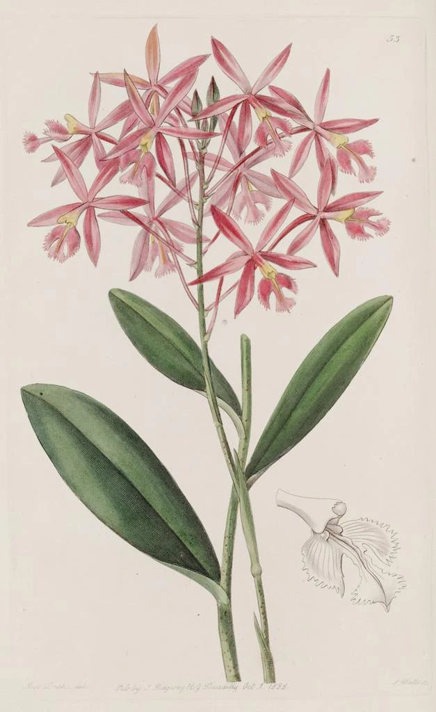 Sydenham Edwards, aktiv i början av 1800-talet, är erkänd som en av de stora botaniska illustratörerna i sin tid. Utbildad inom den vetenskapliga världen, lyckades han förena konst och vetenskap och hylla floran genom sina verk. Hans illustrationer, inklusive "Epidendrum de M. Schomburgk", vittnar om en period då botanisk utforskning var i full blom, särskilt tack vare expeditioner till Sydamerika. Edwards påverkades av sina samtida upptäckter och bidrog till dokumentationen av växtarter, vilket spelade en avgörande roll i förståelsen och uppskattningen av biologisk mångfald. Hans arbete är en bro mellan konst och vetenskap och markerar en tid då varje växt var en skatt att upptäcka.