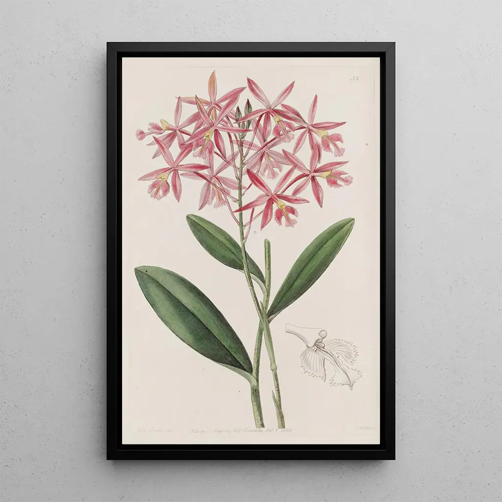 Konsttrycket "Epidendrum de M. Schomburgk" av Sydenham Edwards fördjupar oss i en frodig värld där naturen uttrycker sig med glans. Denna botaniska illustration, utförd med en anmärkningsvärt noggrann detaljrikedom, framhäver de delikata detaljerna i orkidéblommorna. De livfulla nyanserna av grönt, rosa och gult blandas harmoniskt och skapar en atmosfär som är både livfull och lugnande. Akvarelltekniken, använd med bravur, fångar ljuset och texturen i blommornas kronblad, vilket ger en känsla av djup och realism. Varje penseldrag verkar berätta historien om denna fascinerande växt och bjuder in betraktaren att förundras över naturens skönhet.