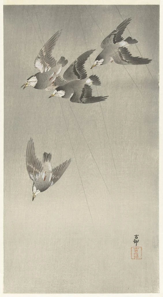 La konsttryck av målningen Étourneaux under regn av Ohara Koson framkallar en scen som är fylld av poesi, där fåglar rör sig graciöst under ett lätt regn. Nyanser av blått och grått blandas harmoniskt, vilket skapar en atmosfär som är både melankolisk och lugn. Tekniken med ukiyo-e, med sina noggranna detaljer, gör det möjligt att känna texturen av vattnet och lättheten i fjädrarna. Detta verk inbjuder till noggrann eftertanke och avslöjar den flyktiga skönheten i ett naturligt ögonblick.