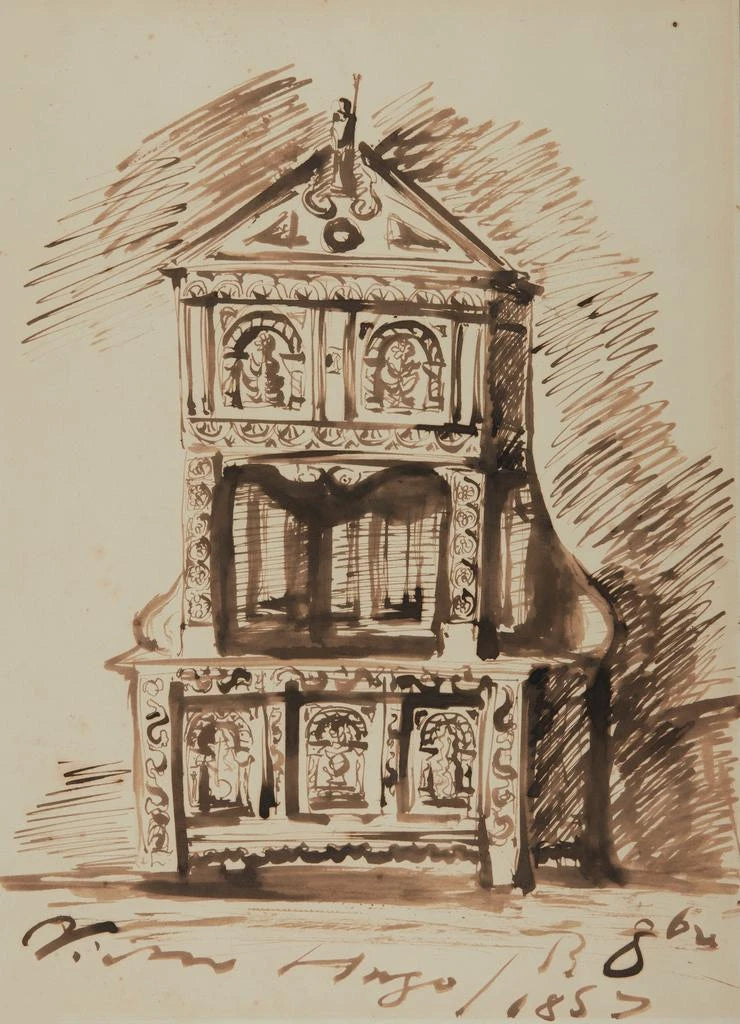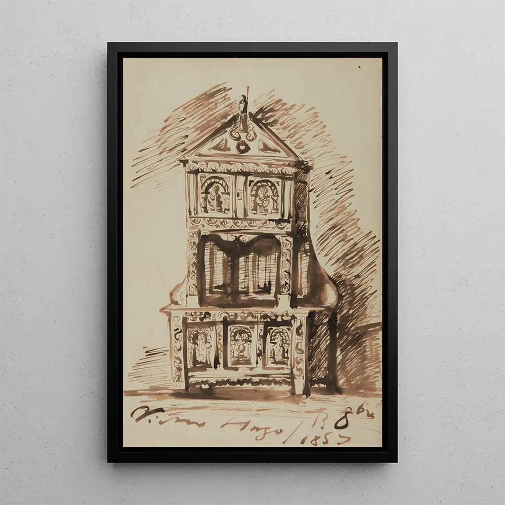 Det konsttryck "Un buffet" av Victor Hugo fördjupar oss i en värld där hantverk möter natur. Kompositionen, rik på detaljer, framhäver ett snidat trämöbel prytt med delikata blomstermotiv. De varma färgerna, från djupa bruna nyanser till mjuka gröna, skapar en inbjudande och varm atmosfär. Hugos måleriteknik, som blandar realism och romantik, ger liv åt denna vardagsföremål och förvandlar den till ett fullvärdigt konstverk. Varje penseldrag verkar berätta en historia och bjuder in betraktaren att stanna upp och beundra skönheten i det enkla.