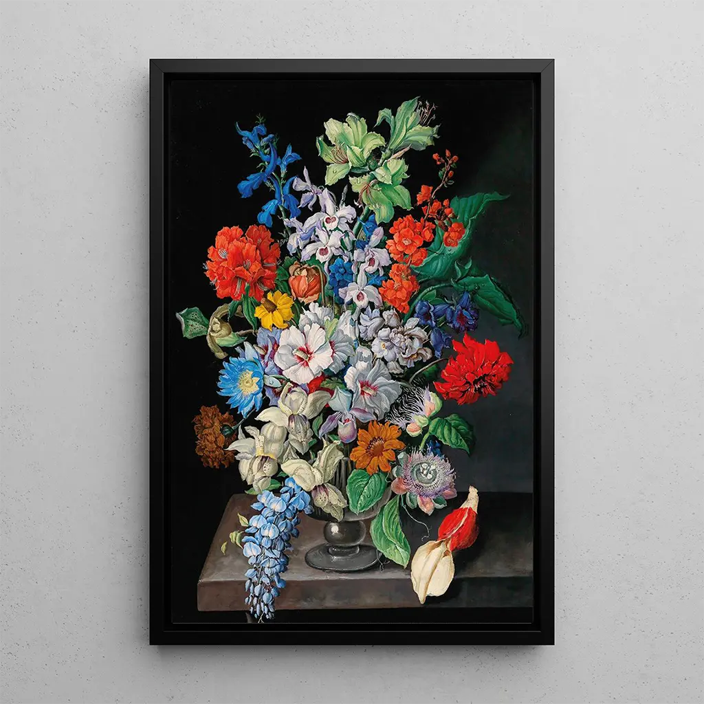 I detta livfulla verk bjuder Sebastian Wegmayr in oss att dyka in i en frodig blomstervärld. Konsttrycket "Ett stort blomsterbukett" utmärker sig med sin strålande palett, där de livfulla nyanserna av kronblad vävs samman i harmoni. Den oljemålningsteknik som konstnären använder möjliggör fångst av ljuset och texturen i blommorna, vilket skapar en atmosfär som är både glad och lugnande. Varje detalj, från delikata nyanser till subtila skuggor, bidrar till att ge liv åt denna komposition, vilket gör detta konsttryck till en verklig hyllning till naturens skönhet.