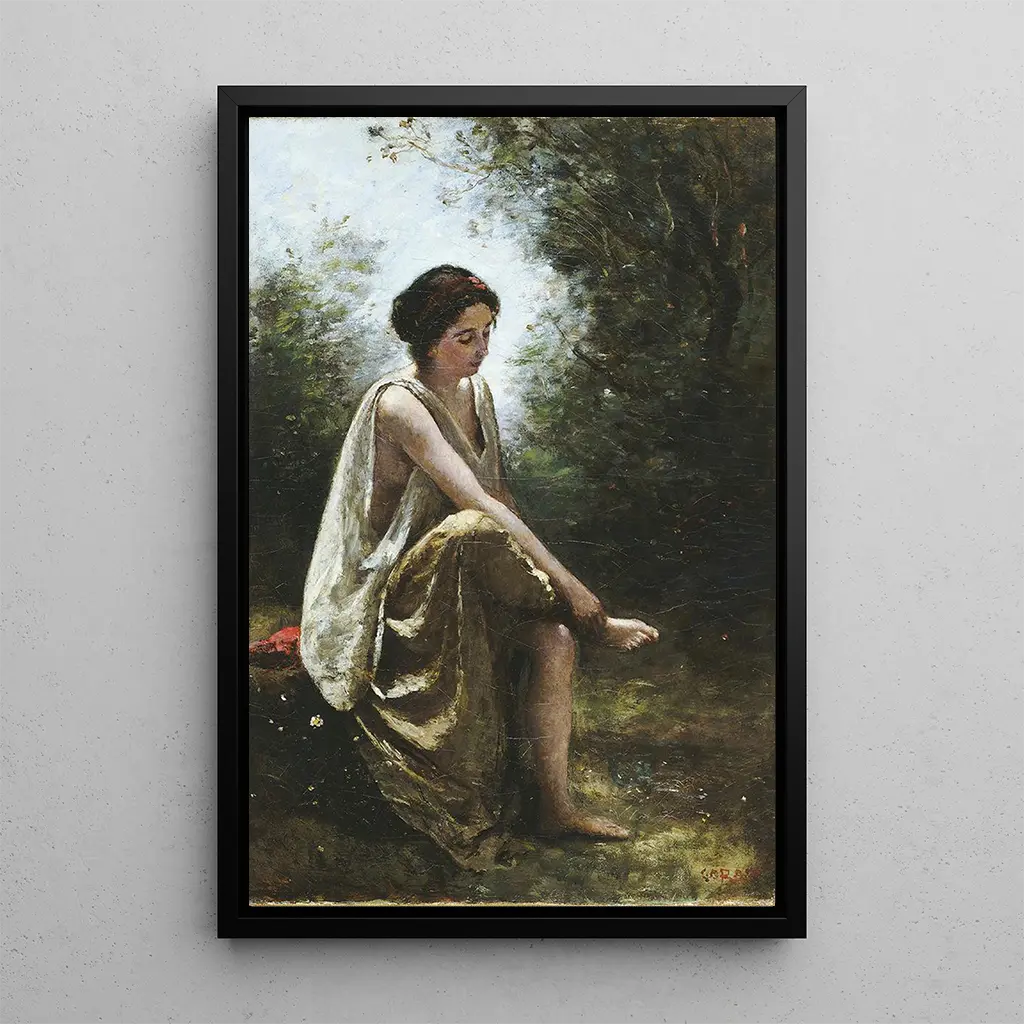 I "Eurydice blessée" skildrar Jean-Baptiste-Camille Corot en gripande scen ur den grekiska mytologin. Figuren av Eurydice, både vacker och tragisk, avbildas i ett ögonblick av sårbarhet, skadad och omgiven av en frodig natur. De mörka färgerna och skuggorna förstärker scenens känslomässiga uttryck, medan det mjuka ljuset som sipprar genom träden skapar en slående kontrast. Corot, med sin delikata måleriteknik, lyckas förmedla en atmosfär av melankoli och förtvivlan, vilket inbjuder betraktaren att känna djupet i detta tidlösa drama.
