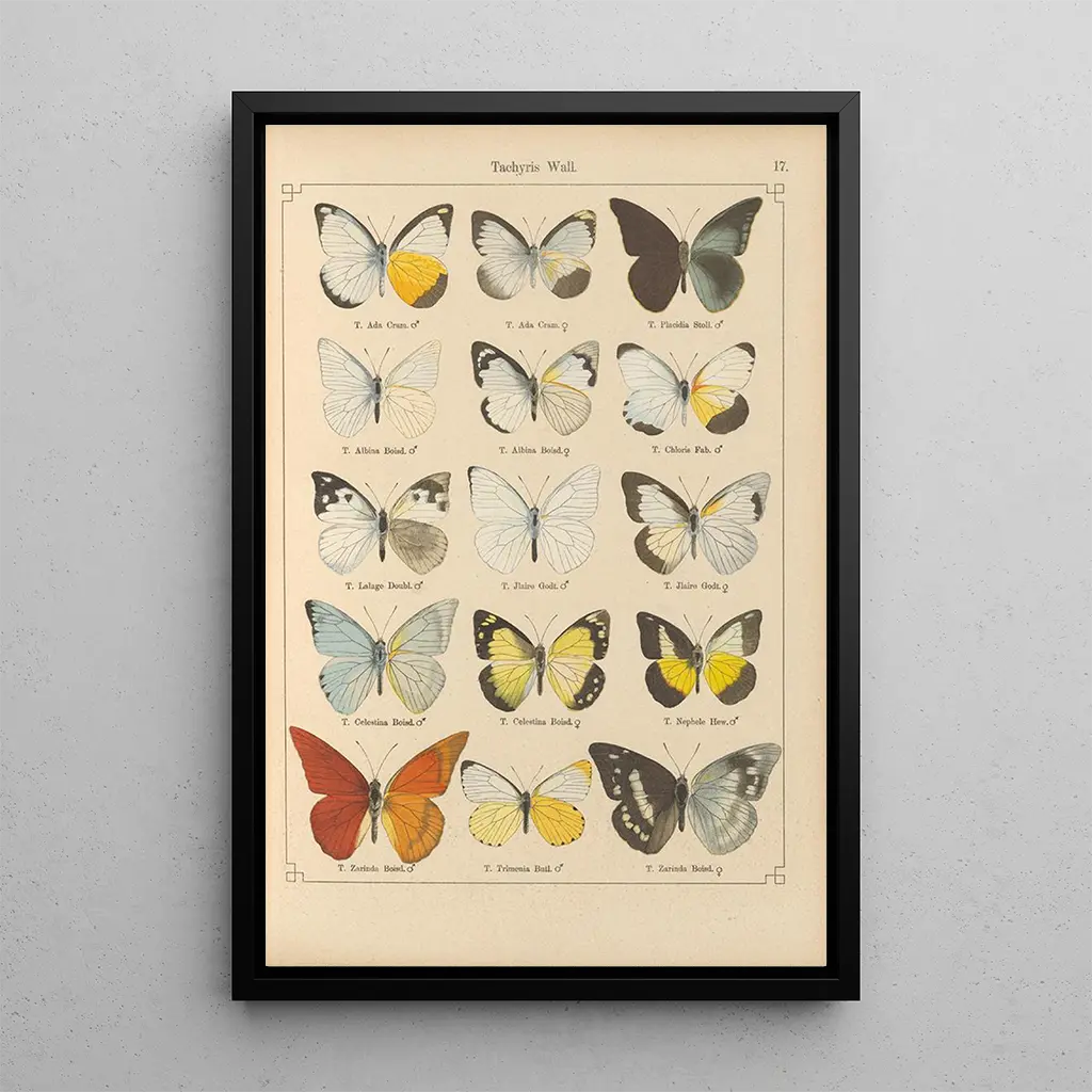 De "Papillons exotiques Pl017" av Otto Staudinger är en verklig hyllning till naturens skönhet. Detta fängslande konsttryck visar en mängd fjärilar i livfulla färger, som illustrerar mångfalden och rikedomarna hos dessa fascinerande insekter. Kompositionen är noggrant balanserad, varje fjäril verkar ta sin flygtur i ett luftigt balett. De klara nyanserna av blått, orange och gult blandas harmoniskt och skapar en glad och lätt atmosfär. Tekniken med akvarell, med sina subtila övergångar och delikata detaljer, ger liv åt dessa flyktiga varelser och bjuder in betraktaren att dyka in i en drömvärld full av förundran.