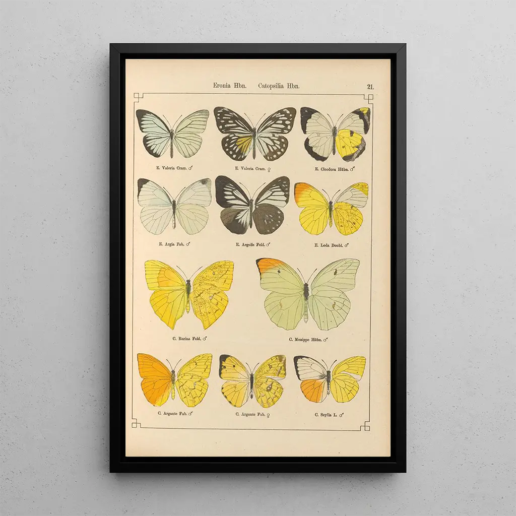 De "Papillons exotiques Pl021" av Otto Staudinger framkallar en livfull värld där naturen uttrycker sig genom strålande färger och delikata former. Detta konsttryck, utfört med en noggrann litografiteknik, fångar lättheten och elegansen hos flygande fjärilar. Nyansen av blått, gult och rött blandas harmoniskt och skapar en atmosfär som är både glad och lugnande. Varje detalj, från de genomskinliga vingarna till de komplexa mönstren, inbjuder till noggrann eftertanke och avslöjar den flyktiga skönheten hos dessa fascinerande varelser.