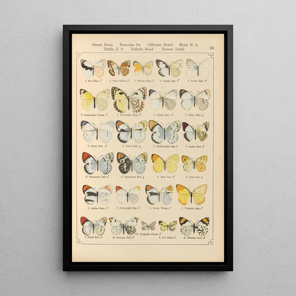 De "Papillons exotiques Pl023" av Otto Staudinger fördjupar oss i en levande värld där lättheten hos vingarna blandas med en strålande palett. Varje noggrant återgivet detalj framkallar elegansen och skörheten hos dessa luftburna varelser. Nyanser av blått, gult och rött dansar över duken och skapar en nästan magisk atmosfär. Staudingers teknik, som kombinerar precision och flyt, gör att man kan känna rörelsen hos papillons, som om de var på väg att flyga iväg. Detta konsttryck inbjuder till eftertanke och förundran inför naturens flyktiga skönhet.