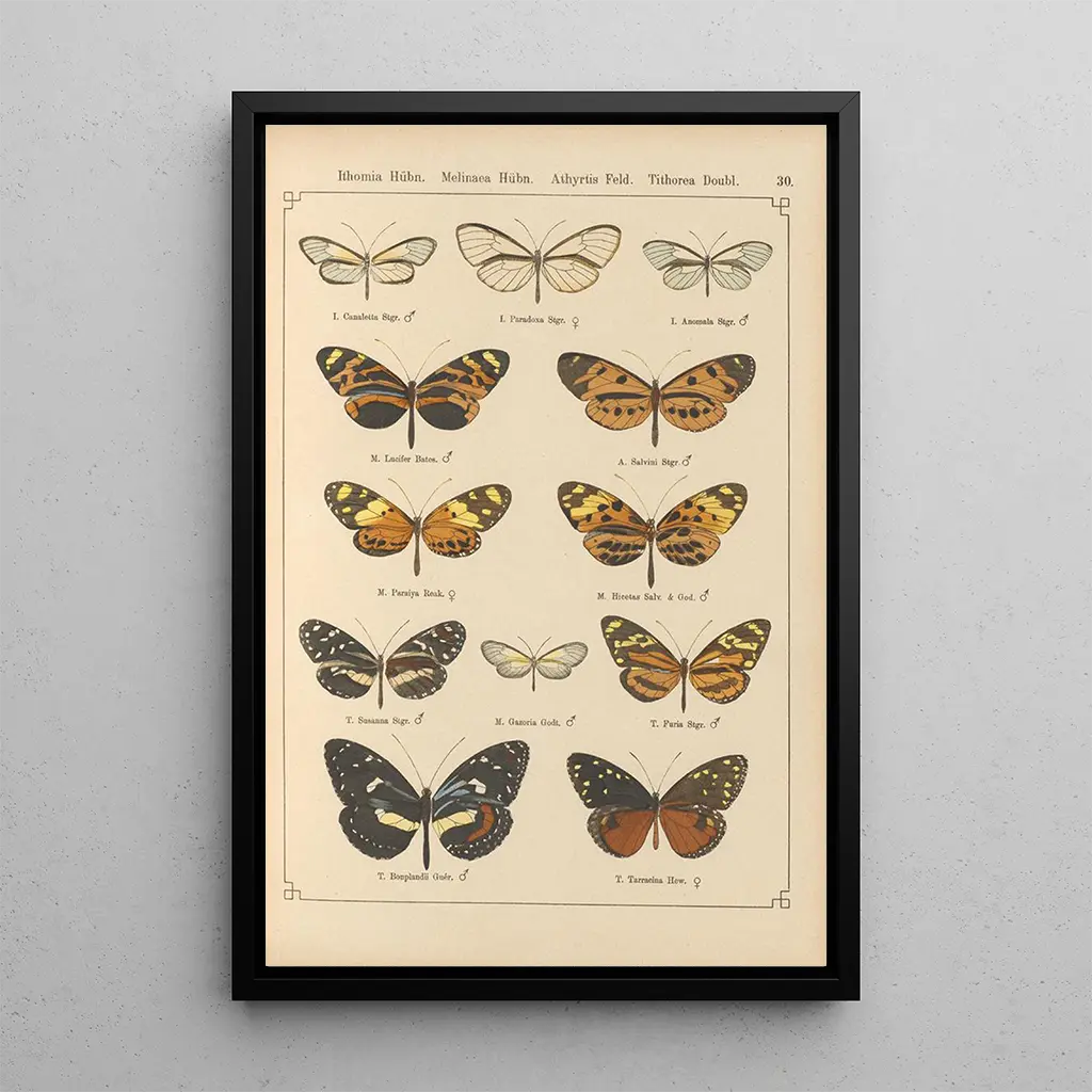 La konsttryck av verket "Papillons exotiques Pl030" av Otto Staudinger tar oss med till en fascinerande värld där färgerna flätas samman för att fira mångfalden av arter. Varje fjäril är avbildad med en anmärkningsvärt noggrann precision, som framhäver de delikata mönstren på deras vingar. De livfulla nyanserna, från klara gröna till djupa röda, skapar en dynamisk och livfull atmosfär. Konstnären lyckas fånga själva essensen av dessa insekter, vilket väcker en känsla av lätthet och rörelse, som om fjärilarna är redo att flyga iväg från duken när som helst.