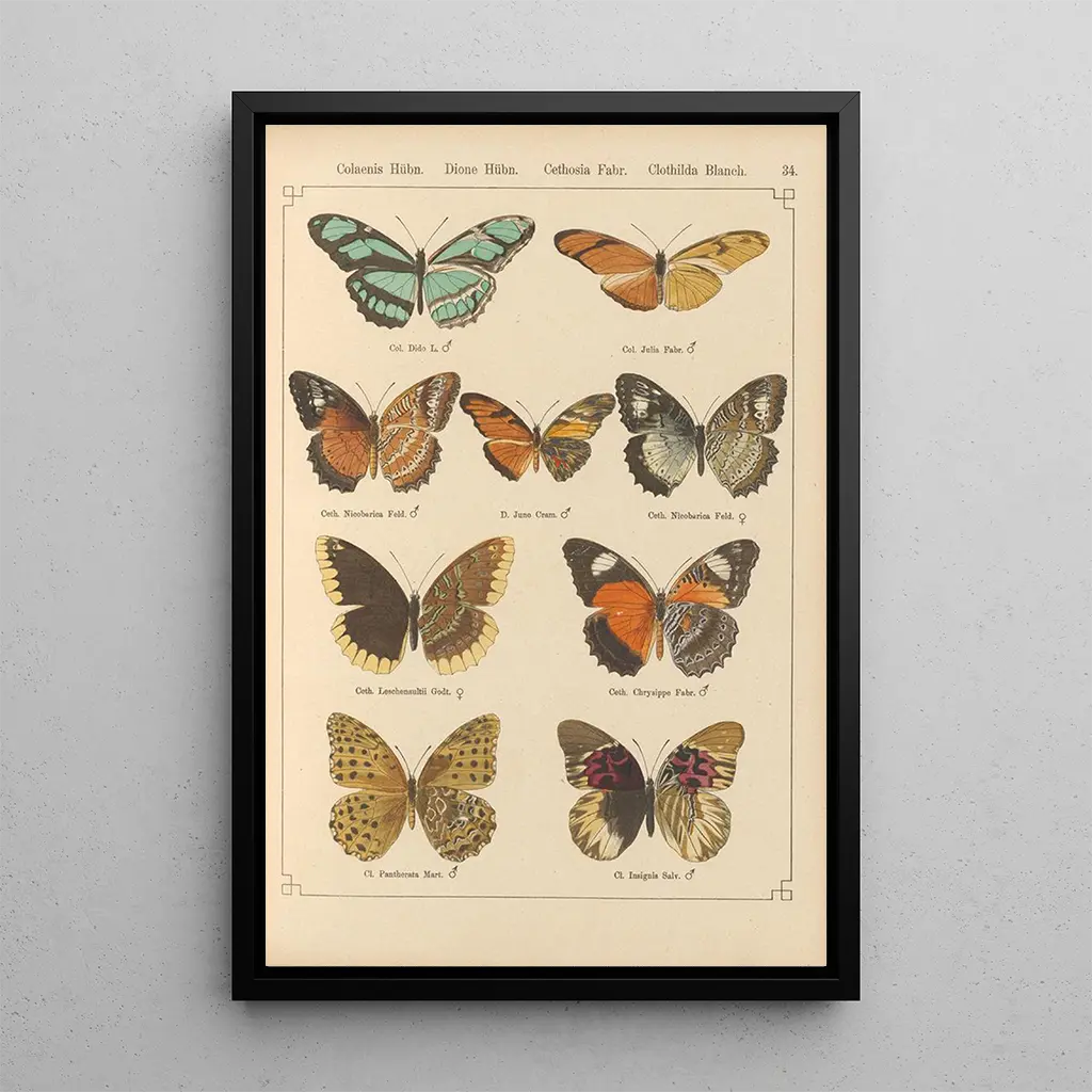 De "Papillons exotiques Pl034" av Otto Staudinger fångar essensen av naturlig skönhet genom en livfull och finstämd komposition. Fjärilarnas vingar, noggrant detaljerade, breder ut sig i ett spektrum av strålande färger, från djupa blå nyanser till ljusa gula. Den akvarellteknik som konstnären använder ger en lätthet till hela verket, vilket skapar en nästan eterisk atmosfär. Varje fjäril tycks komma till liv, redo att flyga iväg, medan den subtila bakgrunden framhäver deras prakt. Detta konsttryck inbjuder till ett lugnt betraktande, ett stilla ögonblick där naturen visar sin fulla prakt.
