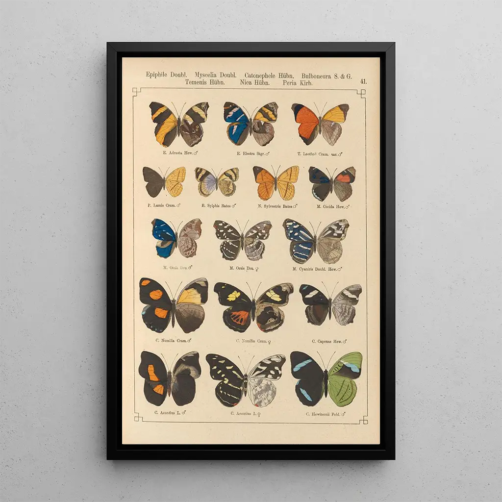 Konsttrycket av verket "Papillons exotiques Pl041" av Otto Staudinger är en verklig hyllning till mångfalden och skönheten hos fjärilar. Varje detalj är noggrant återgiven, från de delikata mönstren på vingarna till de strålande nyanserna som tycks vibrera under ljuset. Tekniken med akvarell, som behärskas av Staudinger, möjliggör att skapa en lätt och luftig atmosfär, där varje fjäril verkar vara på väg att flyga iväg. Detta konsttryck inbjuder till eftertanke, förundran inför den naturliga världens rikedom och magin i de flyktiga ögonblick som fångats på duken.