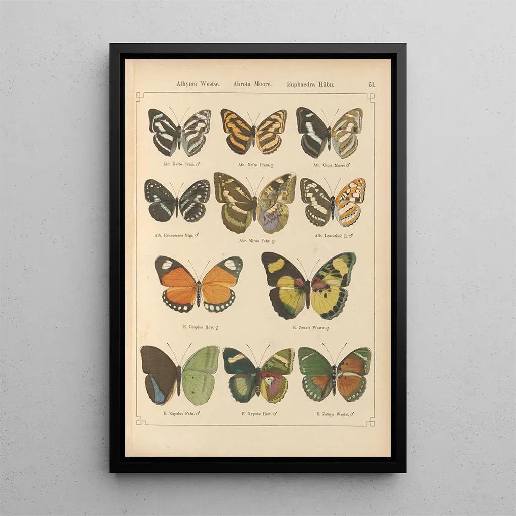 De "Papillons exotiques Pl051" av Otto Staudinger är en hyllning till mångfalden och skönheten hos olika arter. Detta konsttryck, rikt på detaljer, visar fjärilar med livfulla nyanser som nästan tycks sväva ut från duken. Precisionen i linjerna och finheten i färgerna skapar en glad och dynamisk atmosfär, som inbjuder betraktaren att beundra naturens prakt. Varje fjäril, med sina unika mönster, berättar en historia om förvandling och skörhet, och erbjuder en fängslande visuell upplevelse som förflyttar betraktaren till en förtrollande värld.
