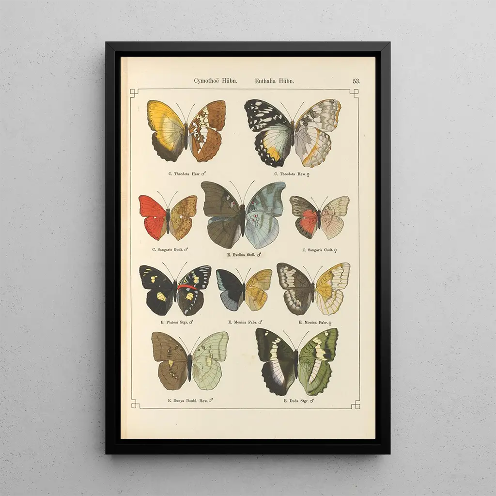 Konsttrycket av verket "Papillons exotiques Pl053" av Otto Staudinger tar oss med till en förtrollande värld där varje fjäril är ett konstverk i sig. De livfulla nyanserna och de delikata mönstren flätar samman för att skapa en visuellt fängslande komposition. Ljuset verkar leka över vingarna, framhäver de minucösa detaljerna och texturen hos insekterna. Denna målning framkallar en atmosfär av lugn och fascination, och bjuder in betraktaren att utforska naturens skönhet ur en ny och poetisk vinkel.