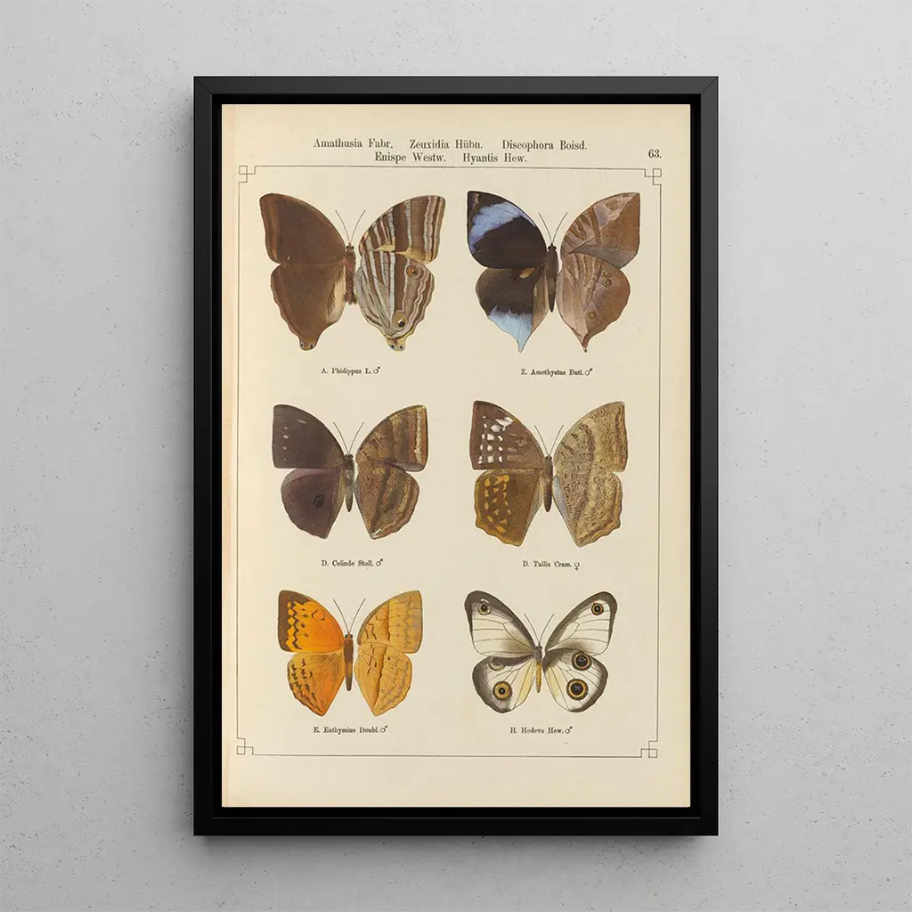 Konsttrycket Papillons exotiques Pl063 av Otto Staudinger är en verklig hyllning till insekternas skönhet. Med sina livfulla nyanser och noggranna detaljer framkallar detta verk en värld där naturen uttrycker sig i all sin prakt. Fjärilarna, varsamt placerade på en harmonisk bakgrund, verkar komma till liv och bjuder in betraktaren att fördjupa sig i deras fascinerande universum. Akvarelltekniken, som används med mästerskap, ger varje vinge en lätthet och transparens som fängslar ögat. Atmosfären som avtecknar sig i denna målning är både lugn och förtrollande, en verklig inbjudan till eftertanke.