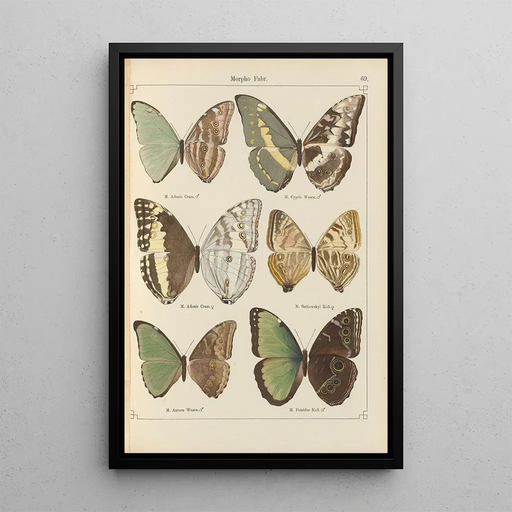 Konsttrycket av "Papillons exotiques Pl069" av Otto Staudinger är en verklig hyllning till naturens skönhet. De livfulla färgerna på fjärilarnas vingar, från klara blå nyanser till gyllene gult, blandas harmoniskt för att skapa en atmosfär som är både glad och lugnande. Akvarelltekniken, använd med fin precision, ger liv åt varje detalj, från de delikata nervarna i vingarna till de subtila skuggorna som omger dem. Detta konsttryck inbjuder till noggrann eftertanke, där varje blick avslöjar en ny nyans och en ny känsla, som om fjärilarna var på väg att flyga ut ur målningen.