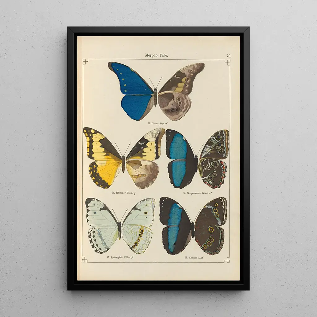 Konsttrycket av "Papillons exotiques Pl070" av Otto Staudinger är en visuell hyllning till lättheten och grace hos fjärilar. De strålande nyanserna, från smaragdgröna till flammande röda, breder ut sig på duken med sådan livfullhet att de nästan verkar leva. Akvarelltekniken, som behärskas av Staudinger, fångar genomskinligheten i vingarna och den delikata mönstringen, vilket skapar en drömlik atmosfär. Varje fjäril, fastfrusen i ett flygögonblick, inbjuder till förundran och utforskning av naturens underverk.