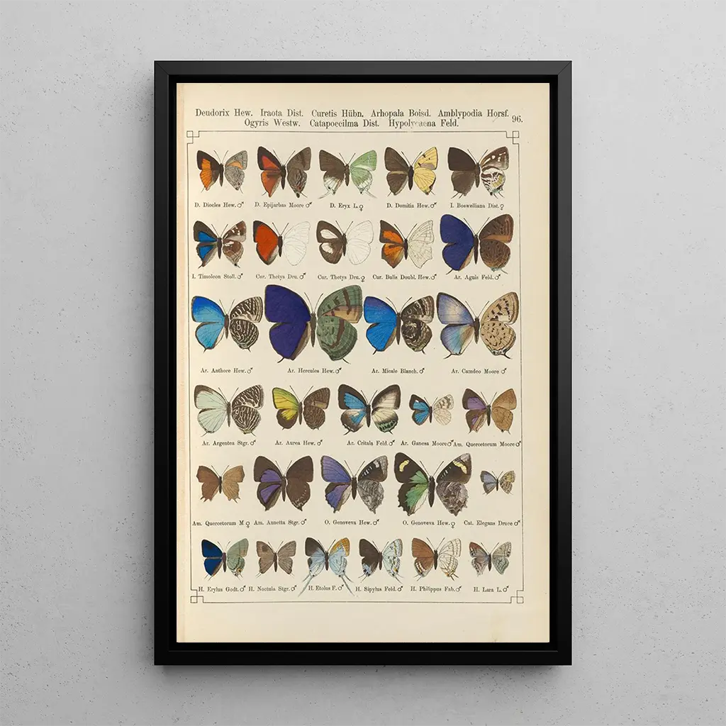 "Papillons exotiques Pl096" av Otto Staudinger fångar själva essensen av den naturliga skönheten genom en explosion av livfulla färger och noggranna detaljer. Varje fjärilvinge är avbildad med en anmärkningsvärt precision, vilket avslöjar delikata mönster som nästan verkar levande. Den akvarellteknik som Staudinger använder ger verket en lätthet, medan nyanser av blått, grönt och gult flätar samman för att skapa en atmosfär som är både glad och lugnande. Detta konsttryck inbjuder till djup eftertanke, där man nästan kan höra vingslagen i en frodig trädgård.