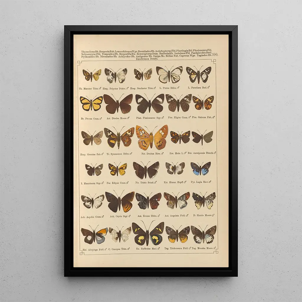 De "Papillons exotiques Pl100" av Otto Staudinger för oss in i en livfull värld där naturen uttrycker sig genom strålande färger och delikata mönster. Detta konsttryck, skapat med en noggrann graveringsteknik, fångar själva essensen av dessa fascinerande varelser. Skiftningarna av blått, gult och rött blandas harmoniskt och skapar en atmosfär som är både glad och lugnande. Varje fjäril tycks komma till liv, redo att flyga iväg, och bjuder in betraktaren att beundra naturens flyktiga skönhet. Kompositionen, som är både rik och balanserad, framkallar en känsla av lätthet och frihet.