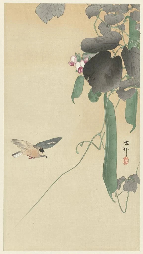 Konsttryck | Fågel på bönplanta med blommor - Ohara Koson