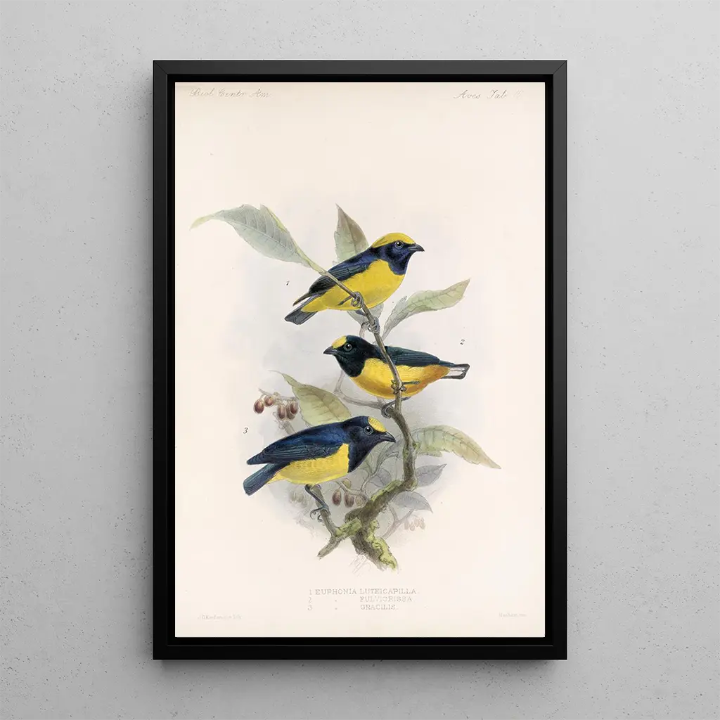 L'œuvre "Aves Pl 17" av Frederick DuCane Godman är en fascinerande skildring av den ornitologiska skönheten. Detta konsttryck, rikt på detaljer, fångar essensen av flera fågelarter, med framstående fjädrar och graciösa poser. De livfulla färgerna, från djupa röda till lysande gult, vävs samman harmoniskt och skapar en livlig och dynamisk atmosfär. Tekniken med akvarell, använd med skicklighet, gör det möjligt att återge fjädrarnas lätthet och formernas delikata elegans. Detta konsttryck inbjuder till noggrann eftertanke, och avslöjar konstnärens minutiösa arbete och den förundran som naturen väcker.