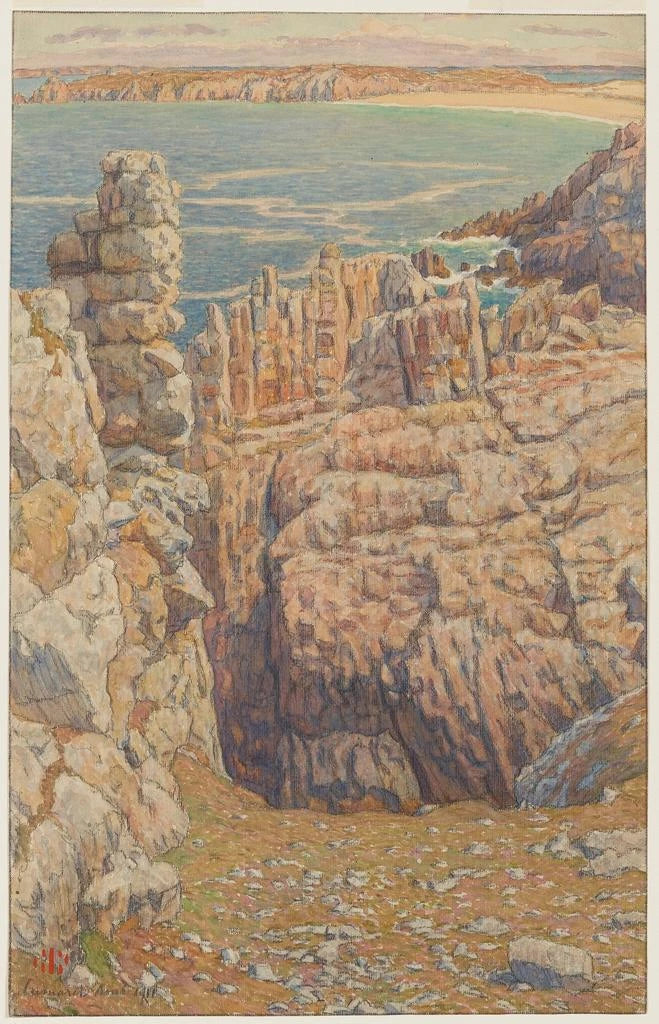 Henri Rivière, artiste français du XIXe siècle, est reconnu pour son rôle dans le mouvement impressionniste et sa fascination pour les paysages marins. Influencé par des maîtres tels que Monet et Pissarro, Rivière développe un style unique qui se concentre sur la lumière et la couleur. Sa carrière est marquée par des voyages à travers la France, mais c'est en Bretagne qu'il trouve une source d'inspiration inépuisable. Les Falaises de Camaret illustrent parfaitement son approche, mêlant réalisme et impressionnisme pour capturer l'essence de la nature. Son œuvre continue d'inspirer et de fasciner, témoignant de l'importance de l'art paysager dans l'histoire de l'art.