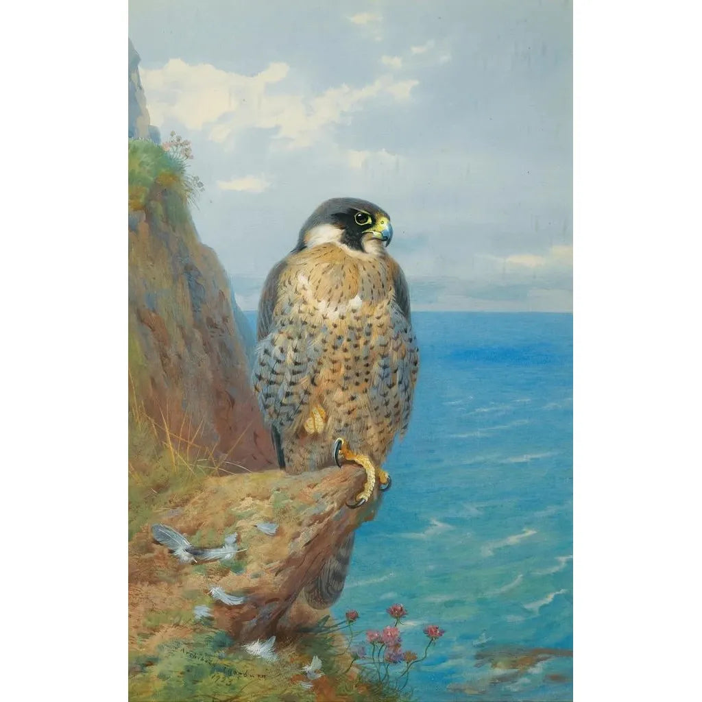 I detta konsttryck av Faucon pèlerin à Auchencairn fångar Archibald Thorburn själva essensen av den brittiska faunan. Tavlan skildrar en majestätisk falk, säkert sittande på en gren, redo att kasta sig ut i himlen. Jordnära färger och nyanser av blått i himlen skapar en atmosfär som är både lugn och dynamisk. Akvarelltekniken, som behärskas av konstnären, gör det möjligt att fint återge fjädrarnas detaljer och det naturliga ljuset, vilket bjuder in till att beundra den vilda naturens skönhet. Denna tavla framkallar en harmoni mellan fågeln och dess omgivning, en scen frusen i tiden.