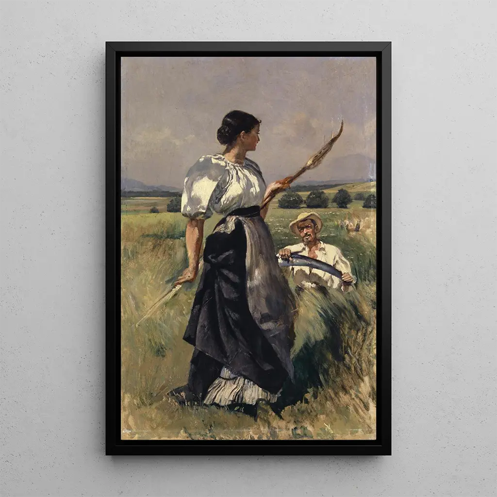 Konsttrycket av Faucheur och skördare, ett ikoniskt verk av Frank Buchser, skildrar med kraft det jordnära livet under 1800-talet. Scenen visar arbetare i full aktivitet, deras synkroniserade rörelser som en hyllning till harmonin mellan människa och natur. De livfulla färgerna, som blandar klara gröna och gyllene gult, fångar solljuset över fälten och skapar en vibrerande och dynamisk atmosfär. Buchsers teknik, som kombinerar precision och uttrycksfullhet, ger liv åt denna skildring av arbetsinsatsen och hyllar värdigheten i det lantliga arbetet.