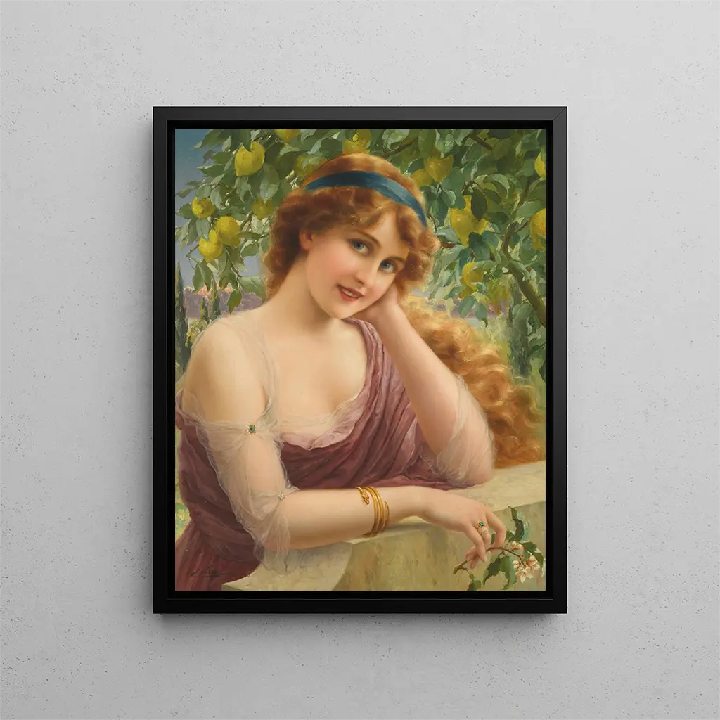 I det stora konstuniversumet lyckas vissa verk fånga själva essensen av skönhet och lugn. "Fille au citronnier - Émile Vernon" är ett av dessa skapelser som inte bara väcker en förfinad estetik, utan också en atmosfär fylld av sötma och nostalgi. Denna målning, som föreställer en ung flicka med drömmande blick, står försiktigt framför ett citronträd i blom, symbol för en frodig natur och ett lugnt liv. Konstnären, med sin skicklighet att leka med ljus och färger, för oss till en värld där tiden tycks stå stilla, och bjuder in betraktaren att fördjupa sig i scenen med förundran.