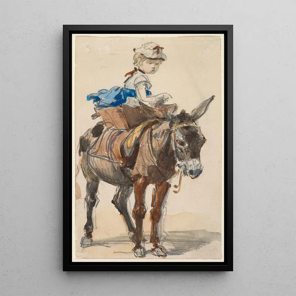 Reproduktionen av "Flicka på en åsna" är ett perfekt val för att tillföra en touch av mildhet till ditt hem. Oavsett om det är i ett barnrum, ett vardagsrum eller ett kontor, kommer denna duk att tilltala med sin charm och sin delikata estetik. Kvaliteten på konsttrycket garanterar en trohet mot detaljerna i originalverket, vilket gör det möjligt att fullt ut njuta av skönheten i denna scen. Genom att integrera detta konsttryck i din inredning skapar du ett välkomnande och inspirerande utrymme, som inbjuder till drömmar och frid.