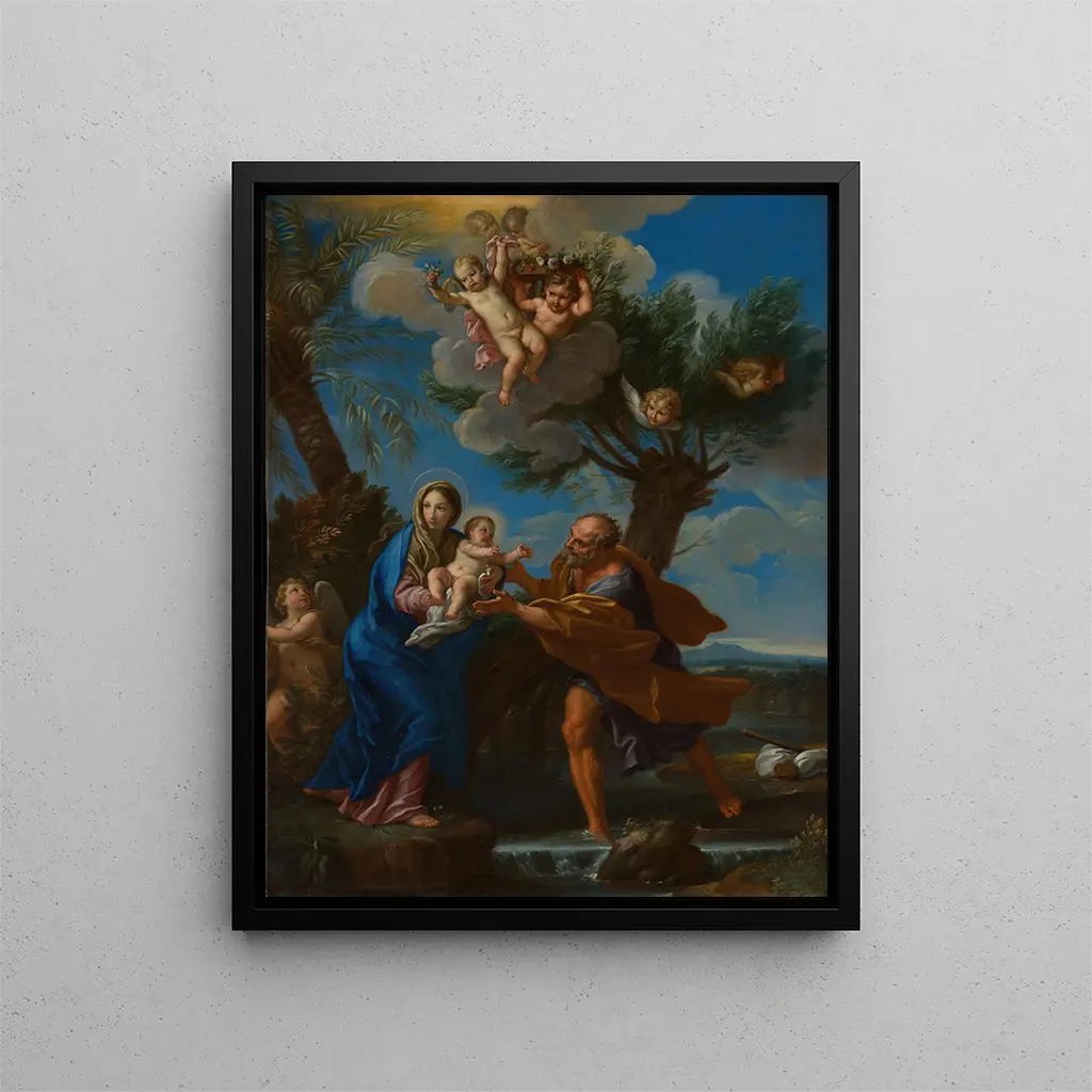 Flykten till Egypten, ett ikoniskt konsttryck av Carlo Maratti, tar betraktaren med på en mystisk resa där ljus och skugga vävs samman för att berätta en historia om skydd och tro. Denna bibliska scen, trots sin symbolik, väcker också universella känslor av tillflykt och hopp. Maratti, mästare av den italienska barocken, lyckas fånga själva essensen av denna flykt, och lyfter fram inte bara figurerna utan även landskapet som omger dem, vilket skapar en atmosfär som är både dramatisk och lugn. Konstverket bjuder in oss att betrakta den väg den heliga familjen har färdats och fördjupar oss samtidigt i en rik och uttrycksfull visuell tolkning.