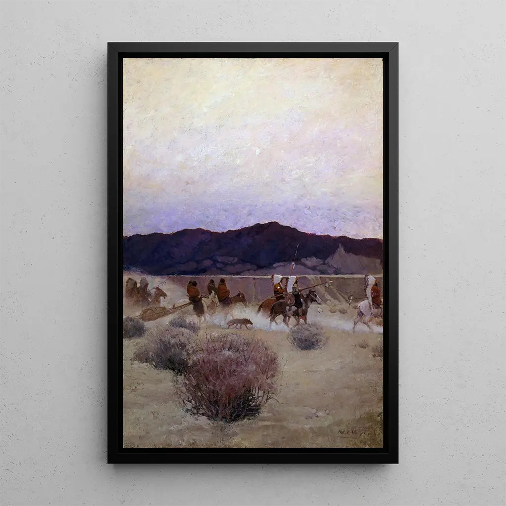 Född 1882 är N. C. Wyeth en av de mest inflytelserika illustratörerna under början av 1900-talet, känd för sina verk som kombinerar konst och berättande. Han påverkades starkt av de stora mästarna inom klassisk målarkonst, samtidigt som han utvecklade en egen stil som förenar realism och romantik. Wyeth arbetade huvudsakligen inom området för bokillustrationer, men hans konstverk, som "Flyttläger", vittnar om hans talang för att fånga visuella berättelser. Hans arbete markerade en tid då illustration var ett kraftfullt kommunikationsmedel, och han bidrog till att forma den amerikanska kollektivbilden.