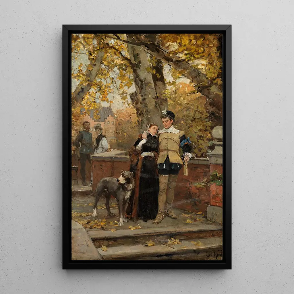 I detta fängslande konsttryck, "Innan avresan", fördjupar sig Carl Hoff i en intim scen där figurerna tycks vara frysta i ett ögonblick av reflektion. Kompositionen är noggrant orkestrerad, blandar varma terrakottatoner med mjuka nyanser av blått som framkallar en atmosfär av melankoli och lugn. Hoff's teknik, som förenar realism och impressionism, gör det möjligt att känna den påtagliga känslan hos protagonisterna. Varje detalj, från ansiktsuttryck till draperingar i kläderna, bidrar till att skapa en atmosfär som är både öm och nostalgisk, vilket inbjuder betraktaren att reflektera över historien som utspelar sig precis innan denna avresa.