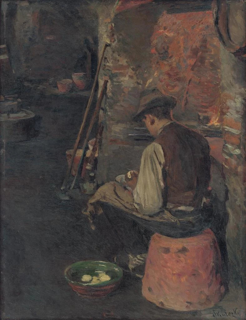 Skutecký utmärker sig genom sin realistiska ansats, som kombinerar en precis teknik med en märkbar känslighet. "Avant le déjeuner" är en perfekt illustration av hans stil, där ljuset spelar en avgörande roll och lyser upp ansikten och föremål med en nästan poetisk ömhet. De varma och jordnära tonerna skapar en välkomnande atmosfär, medan skuggorna tillför djup som inbjuder till utforskning. Kompositionen av målningen, balanserad och harmonisk, guidar blicken genom scenen och avslöjar gradvis nyanserna i den mänskliga interaktionen. Denna målning nöjer sig inte med att skildra ett ögonblick; den fångar essensen av det, och erbjuder betraktaren en immersiv upplevelse som överskrider det enkla att titta på.