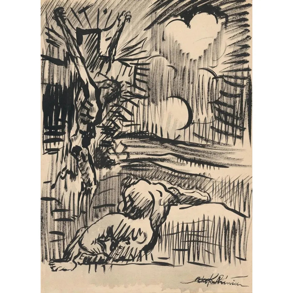 Dans cette œuvre poignante, Allongé devant le crucifix, Arnold Peter Weisz-Kubínčan nous plonge dans une atmosphère de profonde réflexion spirituelle. La composition, centrée sur la figure allongée, est accentuée par des couleurs sombres, créant un contraste saisissant avec la lumière qui émane du crucifix. La technique de l'artiste, mêlant réalisme et expressionnisme, renforce l'intensité émotionnelle de la scène. Chaque détail, des plis du drap aux expressions faciales, invite à une contemplation silencieuse, où la souffrance et la rédemption se rencontrent.