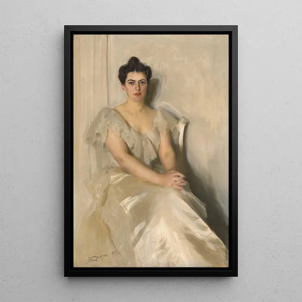 I detta konsttryck av Frances Folsom Cleveland fångar Anders Zorn essensen av en kvinna som är både stark och ömtålig. Tavlan, badad i ett mjukt ljus, framhäver varma toner och nyanser av beige som skapar en intim atmosfär. Zorns teknik, som blandar olja och akvarell, ger verket en anmärkningsvärt flytande känsla, medan de noggranna detaljerna i Frances ansikte och hennes klänning skapar en slående kontrast mot den suddiga bakgrunden. Detta porträtt nöjer sig inte med att avbilda en historisk figur, utan inbjuder också till reflektion över skönhet och komplexiteten i mänskliga relationer.