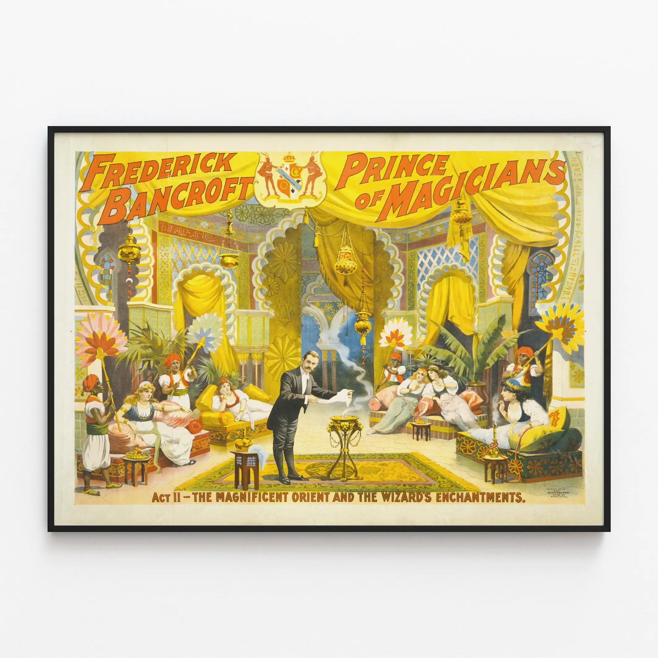 Découvrez cette affiche vintage illustrant Frederick Bancroft, présenté comme le "Prince of Magicians", dans une scène intitulée "Act II – The Magnificent Orient and the Wizard's Enchantments". Ce poster de décoration murale est un excellent exemple d'art graphique du spectacle et de la magie, mettant en avant un univers magique et orientaliste. L'image dépeint un intérieur richement décoré avec des éléments architecturaux d'inspiration orientale, des tentures jaunes chatoyantes et un décor somptueux où des personnages en costumes colorés entourent le magicien en pleine performance. Cette affiche se distingue par son style peint, la richesse des couleurs et l'ambiance mystérieuse qu'elle dégage, idéale pour apporter une touche d'originalité et d'histoire à votre décoration intérieure. En tant que pièce de décoration murale, ce poster vintage est parfait pour les amateurs d'arts anciens, de spectacles de magie et de décors exotiques. Il invite à une immersion visuelle dans un univers fascinant où l'illusion et la magie prennent vie dans un cadre chaleureux et détaillé. Posée sur un mur, cette affiche attire le regard et stimule l'imagination, faisant de votre espace un lieu unique et captivant. Ce tableau mural est également adapté pour les intérieurs de style rétro ou baroque, ainsi que pour ceux qui souhaitent intégrer une touche culturelle et théâtrale à leur ambiance. Que ce soit dans un salon, un bureau ou une salle dédiée à la détente, ce poster ajoute du caractère avec ses motifs élaborés et son thème enchanteur. Apportez à vos murs une œuvre d'art murale originale et enrichissante, célébrant la magie des spectacles anciens et l'art graphique du XIXe siècle. Cette affiche vintage, avec ses détails soignés et sa composition équilibrée, est un choix idéal pour embellir votre décoration murale avec sophistication et authenticité.