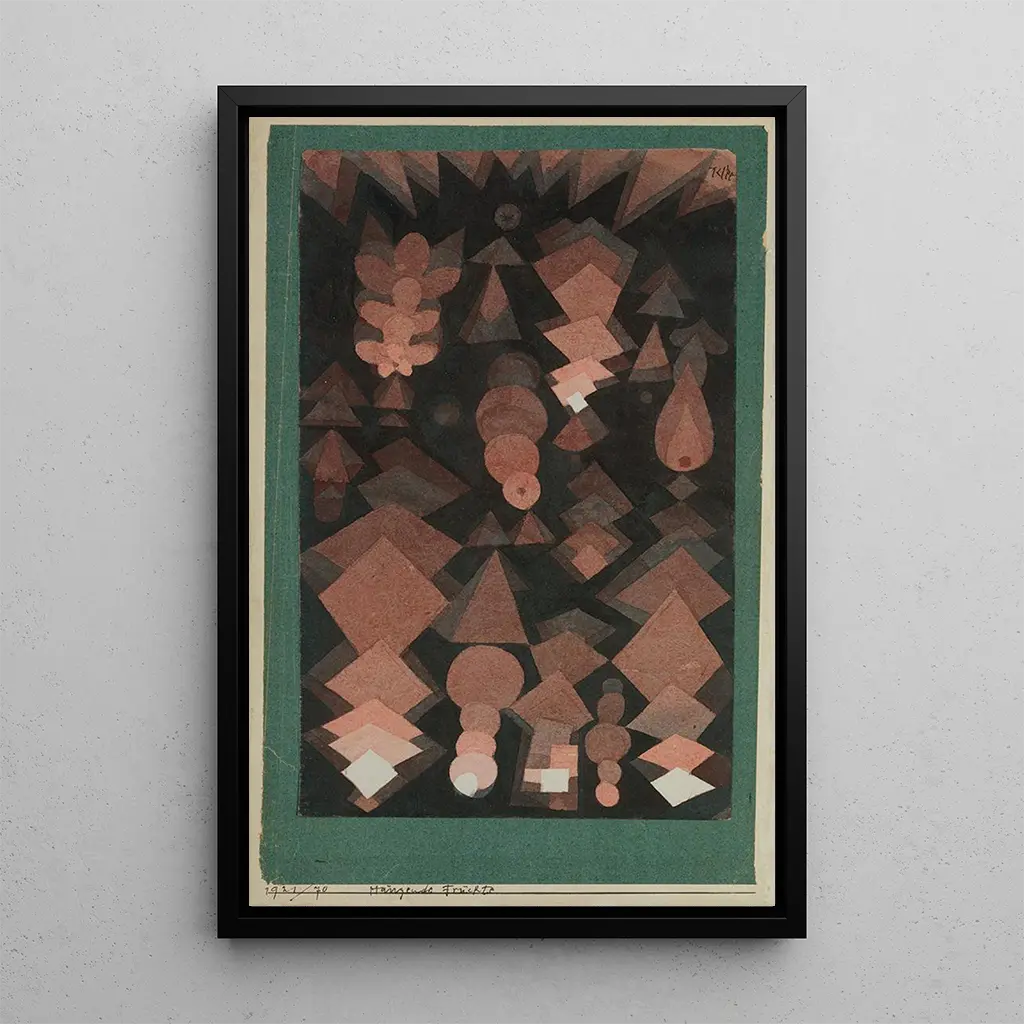 "Fruit suspendu" av Paul Klee är ett konsttryck som framkallar en lekfull och poetisk värld, där organiska former svävar i ett abstrakt utrymme. De livfulla färgerna, såsom rött och gult, blandas harmoniskt och skapar en glad och lätt atmosfär. Naturens element, stiliserade på ett sätt som utmanar gravitationen, verkar bjuda in betraktaren att dyka in i en drömvärld. Denna duk, både enkel och komplex, förkroppsligar Klees förmåga att förvandla bekanta objekt till symboler för djupa känslor.