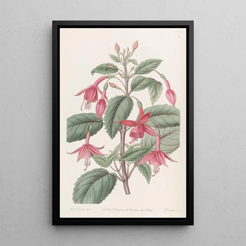 Konsttrycket av Fuchsia de Standish, utfört av Sydenham Edwards, är en sann hyllning till naturens skönhet. Denna målning utmärker sig genom sina livfulla nyanser av rosa, lila och grönt, som flätas samman för att skapa en harmonisk och dynamisk komposition. De delikata fuchsia-blommorna, med sina hängande kronblad, tycks nästan dansa under en mild vindpust. Den akvarellteknik som Edwards använder ger verket en lätthet och transparens, vilket möjliggör att färgerna subtilt överlappar varandra. Atmosfären som utstrålar från detta konsttryck är både glad och lugnande, inbjudande betraktaren att fördjupa sig i en frodig trädgård.