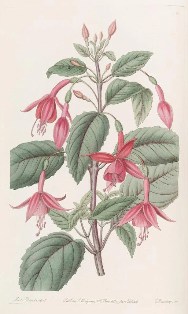 Sydenham Edwards, verksam under början av 1800-talet, är erkänd som en av de första botaniska illustratörerna av sin tid. Utbildad vid Royal Academy, lyckades han fånga växternas skönhet med en anmärkningsvärt noggrann precision. Hans verk, inklusive Fuchsia de Standish, vittnar om hans engagemang för vetenskap och konst, där dessa två discipliner förenas för att utbilda och förundra. Edwards påverkades av de botaniska upptäckter som gjordes under hans tid, särskilt utforskningar av nya växtarter. Hans arbete spelade en avgörande roll i dokumentationen av exotiska växter, vilket bidrog till utvecklingen av hortikultur och blomsterdekoration i Europa.