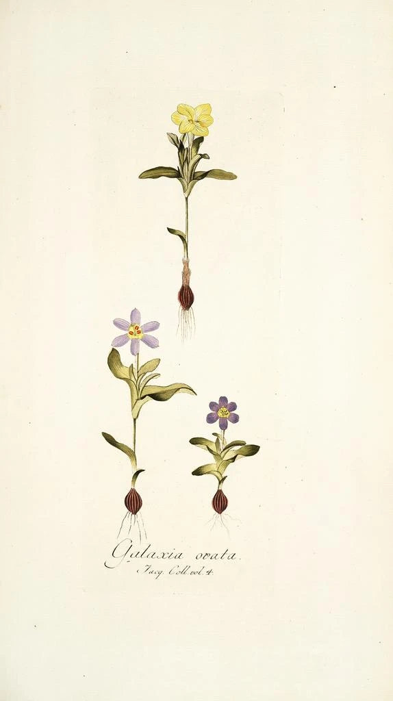 Nikolaus Joseph Freiherr von Jacquin, botanist och konstnär från 1700-talet, lyckades förena vetenskap och konst i sina skapelser. Född 1727, påverkades han av de botaniska upptäckterna i sin tid, särskilt under sina resor till Sydamerika. Hans verk, inklusive Galaxia ovata, vittnar om hans engagemang för att avbilda växtfloran med vetenskaplig precision samtidigt som de behåller en estetisk dimension. Jacquin är erkänd för att ha bidragit till utvecklingen av konstnärlig botanik, ett område som möjliggjorde dokumentation av den växtliga mångfalden samtidigt som det tilltalade en publik som sökte skönhet och kunskap.