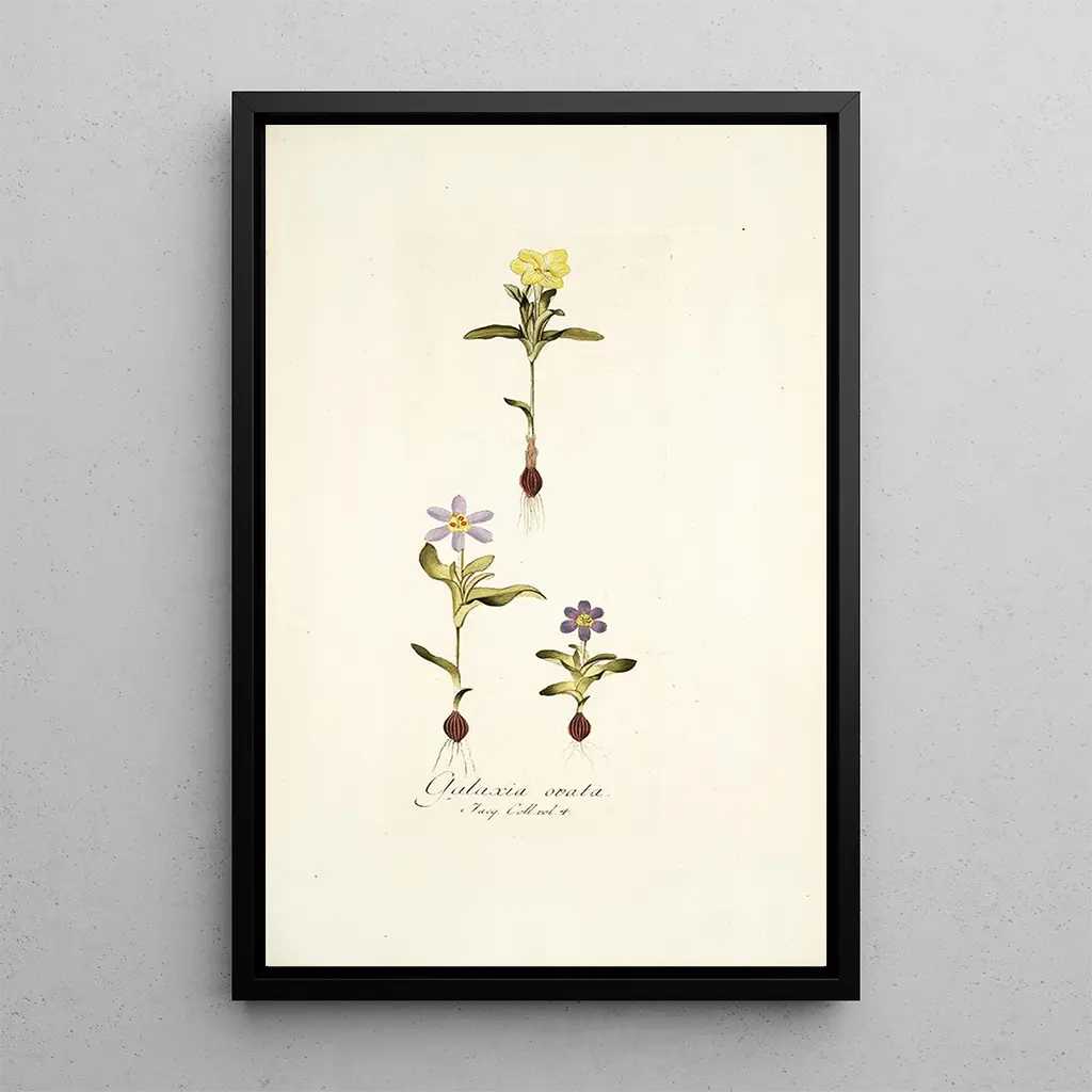 Konsttrycket av Galaxia ovata fördjupar oss i en fascinerande botanisk värld, där nyanser av grönt och blått blandas harmoniskt. De delikata bladen, med rundade konturer, tycks utbre sig med grace och ger en känsla av nästan flytande lätthet. Tekniken av akvarell, behärskad av Nikolaus Joseph Freiherr von Jacquin, erbjuder en transparens som ger liv åt varje detalj och hyllar naturens skönhet. Atmosfären som avtecknar sig i detta verk inbjuder till eftertanke, som om varje penseldrag berättar en historia om tillväxt och blomstring.