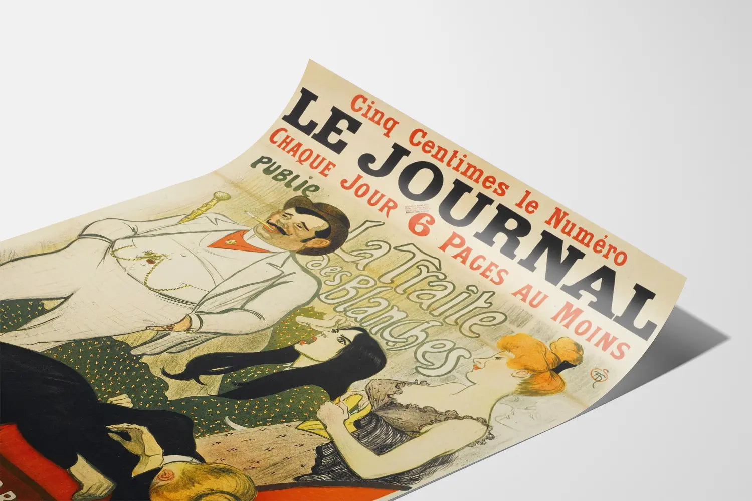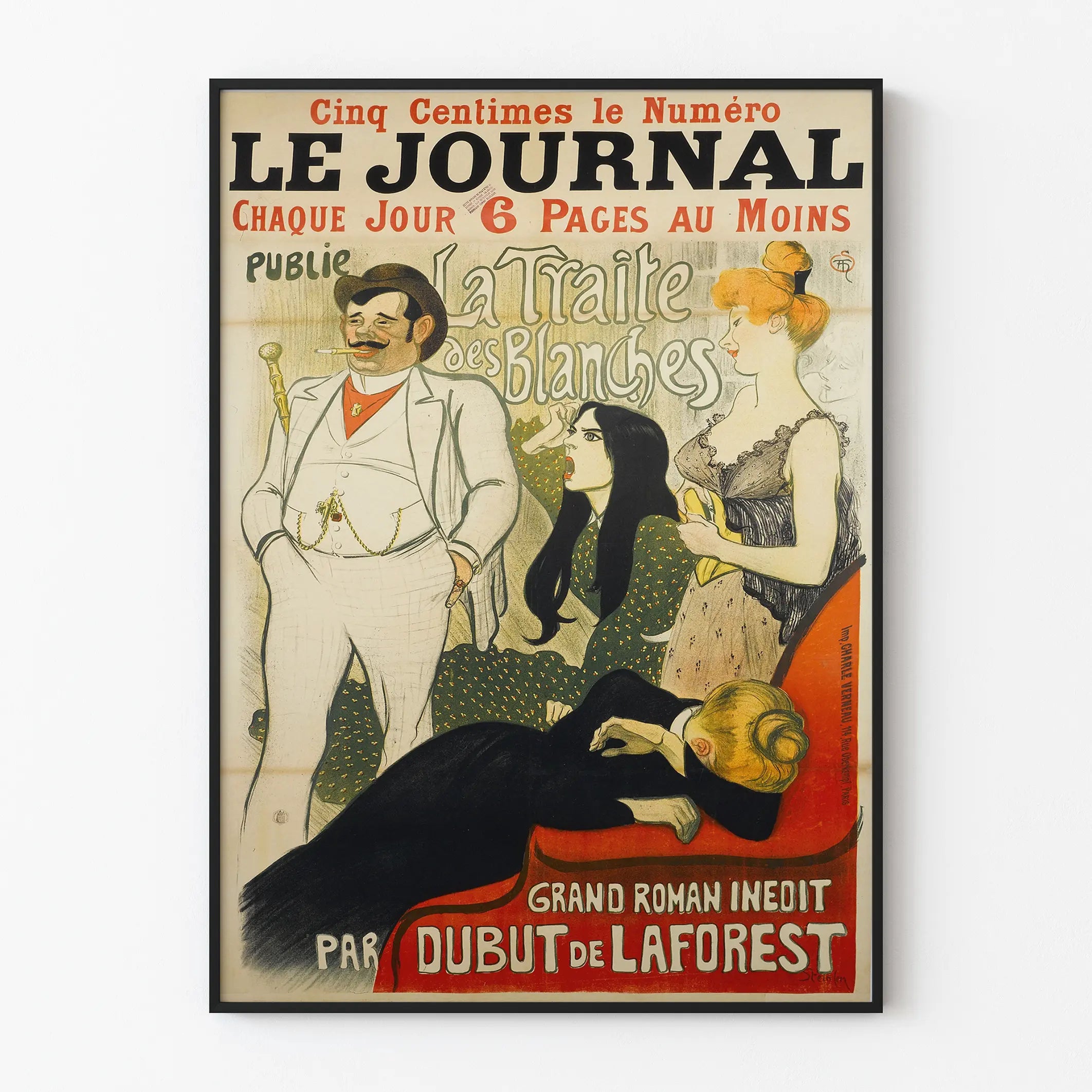 Sammanfattningsvis är denna affisch "Le Journal La Traite des Blanches" en enastående väggdekoration, som förenar konst, historia och vintage-estetik, och som kommer att förhöja dina utrymmen med originalitet och karaktär.