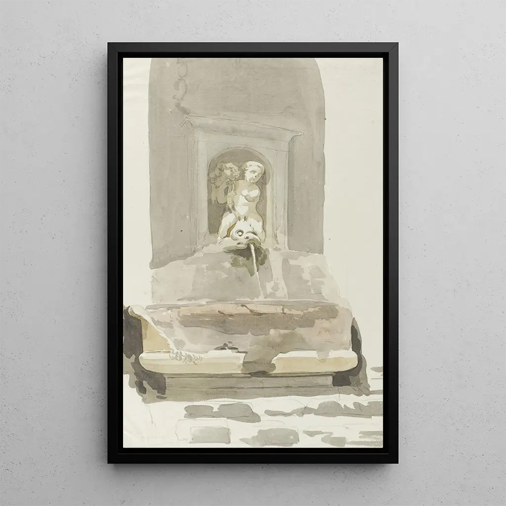 I "Ancien konsttryck som fontäne i Messina" fördjupar Abraham Louis Rodolphe Ducros oss i en värld där historia och konst möts. Denna konsttryck, som föreställer ett konsttryck omvandlat till fontäne, framkallar Messinas rika kulturarv. De skulpturala detaljerna i konsthantverket, framhävs av ljusspel, skapar en atmosfär som är både majestätisk och lugn. Nuancer av sten och vatten blandas harmoniskt, och ger en poetisk bild av detta historiska föremål, samtidigt som den tidlösa skönheten i klassisk konst betonas.