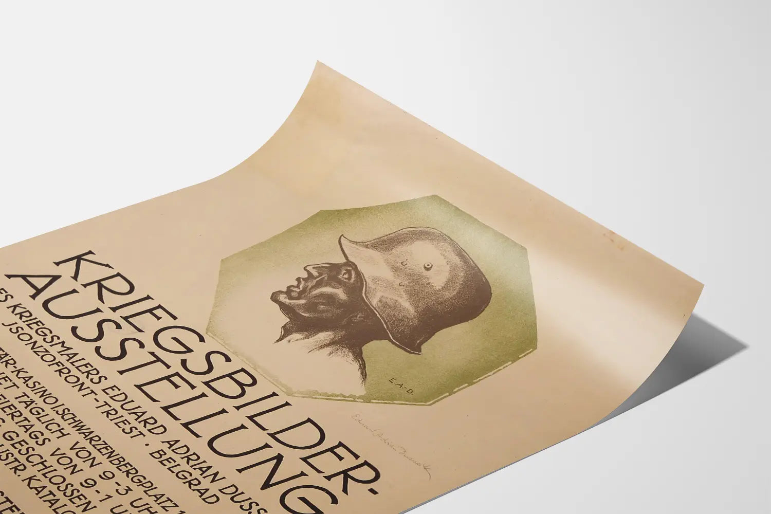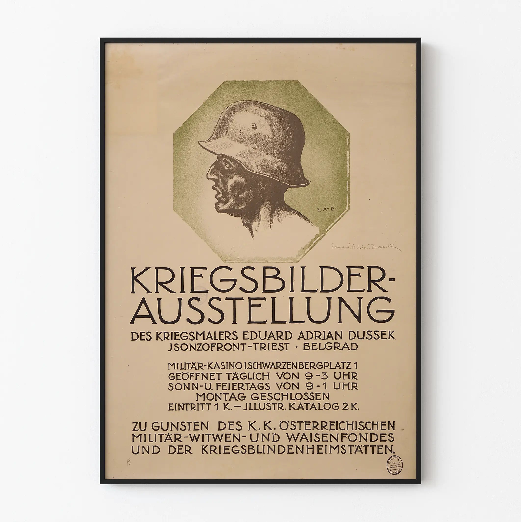 Denna vintageaffisch är ett väggdekorationselement som återspeglar en utställning av krigsmålningar skapade av konstnären Eduard Adrian Dussek. Den enkla men uttrycksfulla designen visar ett porträtt av en soldat med hjälm, vilket perfekt illustrerar andan och intensiteten i det militära temat. Med en grafisk stil präglad av precisa linjer och en kontrollerad användning av färgnyanser framstår denna affisch som ett unikt dekorativt inslag för entusiastiska historieälskare och konstentusiaster.