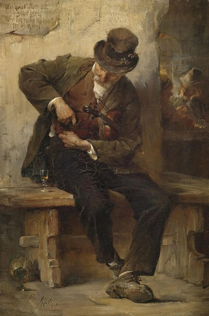 I "Musikalisk gatuföreställning framför ett värdshus" fångar Friedrich von Keller essensen av en livlig scen, där musik och gemytlighet möts. Tavlan skildrar en musiker, klädd i traditionella kläder, som spelar sitt instrument framför ett välkomnande värdshus. De varma och jordnära färgerna, kombinerade med inslag av gyllene ljus, skapar en varm och festlig atmosfär. De noggrant utarbetade detaljerna i förbipasserandes ansikten och de arkitektoniska elementen i värdshuset ger djup åt verket och bjuder in betraktaren att fördjupa sig i denna vardagslivsscen.