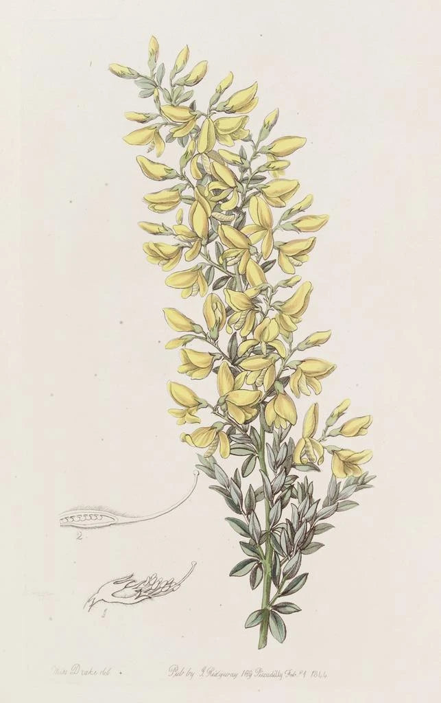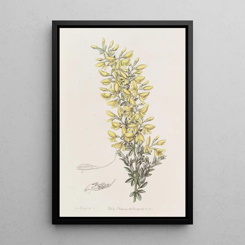 Konsttrycket "Genêt grenue" av Sydenham Edwards är en verklig hyllning till den brittiska floran. Med delikata inslag av gult och grönt framkallar verket solljus som filtrerar genom bladen, vilket skapar en lugn och rofylld atmosfär. Tekniken med akvarell, behärskad av konstnären, möjliggör att fånga transparensen och lättheten hos blommorna, samtidigt som den ger liv åt de minucösa detaljerna i kronblad och stjälkar. Detta konsttryck inbjuder betraktaren till en mjuk, nästan meditativ reflektion, där varje element tycks vibrera i naturens takt.