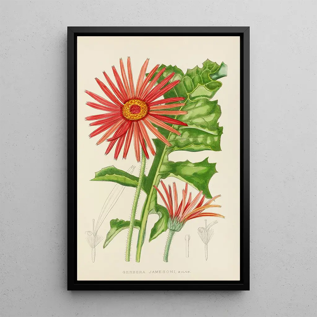 Detta konsttryck av Gerbera jamesoni är ett utmärkt val för att försköna ditt hem, oavsett om det är i ett vardagsrum, ett kontor eller ett sovrum. Den livfulla färgpaletten ger en glädjefull och dynamisk touch till vilket utrymme som helst. Kvaliteten på trycket garanterar en trohet mot detaljerna i originalverket, så att du kan njuta av hela blomans prakt. Genom att lägga till detta konstverk i din inredning skapar du en fängslande fokuspunkt som fångar blickar och väcker beundran. Skäm bort dig själv med detta konsttryck och låt dig förföras av den tidlösa blomsterskönheten den förkroppsligar.