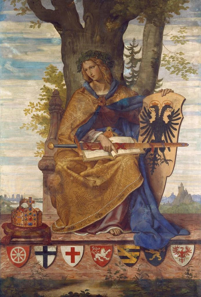 I verket Germania fördjupar sig Philipp Veit i en symbolisk framställning av Tyskland. Kompositionen domineras av livfulla färger och slående kontraster, där rött, svart och guld blandas harmoniskt. Den centrala figuren, majestätisk och feminin, förkroppsligar den nationella andan, omgiven av naturliga element som återspeglar den tyska landskapets rikedom. Veits teknik, som kombinerar romantik med neoklassiska influenser, skapar en atmosfär som är både högtidlig och inspirerande, inbjudande betraktaren till reflektion över identitet och historia.