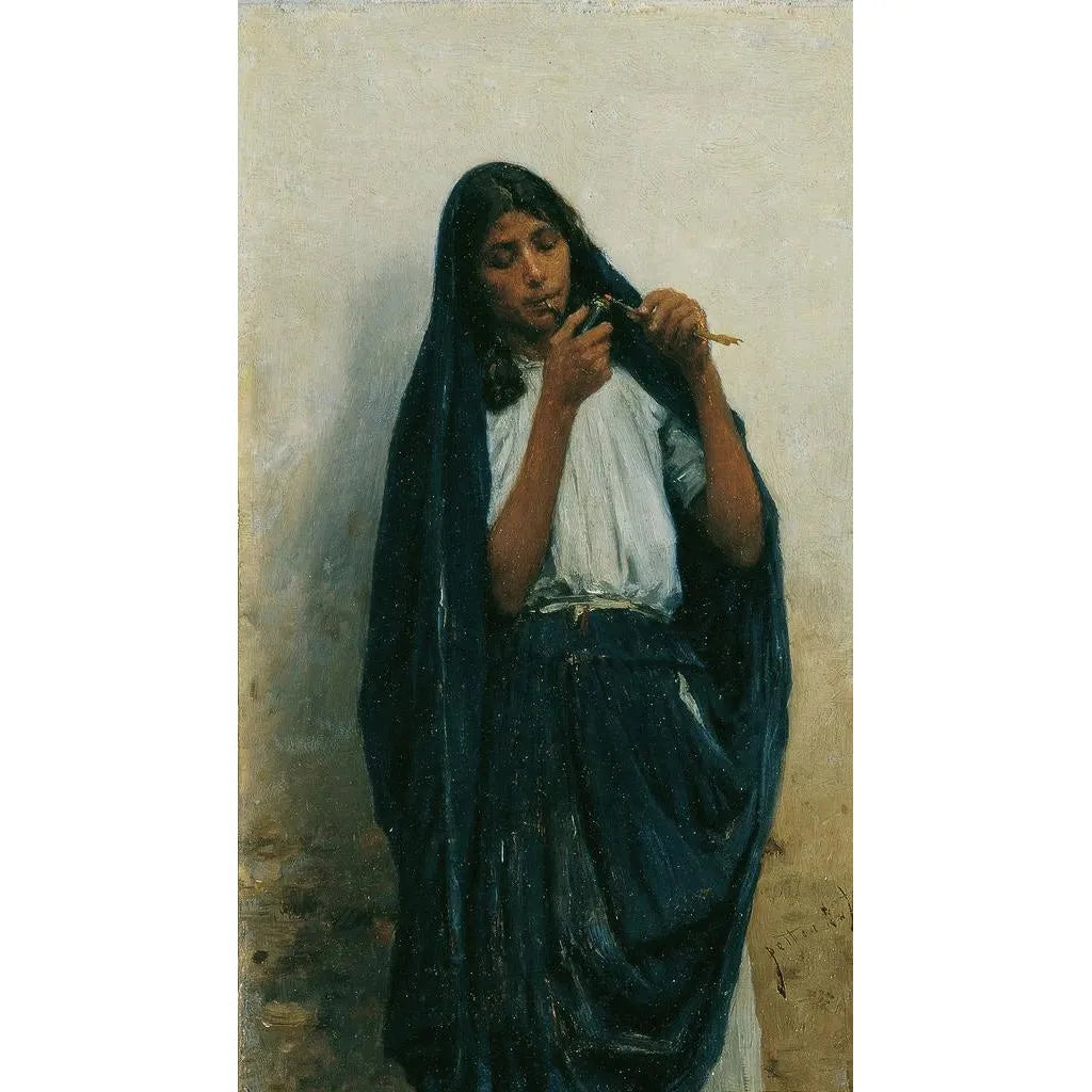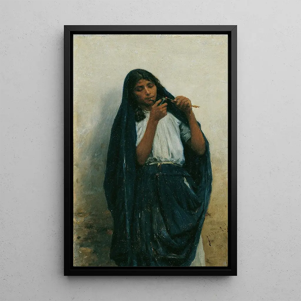 Konsttrycket av verket "Gitane" av August von Pettenkofen fångar med bravur essensen av en gitansk dansare i full prestation. De livfulla och varma färgerna, såsom rött och guld, framkallar passion och vitalitet i den gitanska kulturen. Konstnärens teknik, som blandar realism och impressionistiska drag, skapar en vibrerande atmosfär där rörelsen nästan känns påtaglig. Den fängslande blicken hos dansaren, tillsammans med hennes rikt utsmyckade kostym, drar omedelbart till sig ögat och inbjuder till att fördjupa sig i den förtrollande världen av musik och dans.