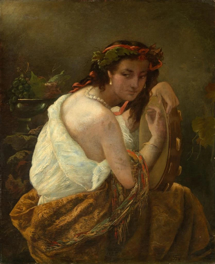 Anselm Feuerbach, född 1829 i Tyskland, är en framstående figur inom den romantiska rörelsen. Uppvuxen i en konstnärlig miljö, påverkades han av mästare som Delacroix och Düsseldorfskolan. Hans bana ledde honom till att utforska olika teman, från mytologi till vardagsliv, men det är hans förmåga att förena realism med en emotionell dimension som utmärker honom. Feuerbach spelade också en viktig roll i att omvärdera den klassiska målarkonsten, och strävade efter att återupprätta värdigheten för figurativ konst i en tid då impressionismen började dominera. Hans verk "Gitane med tamburin" illustrerar detta tydligt.