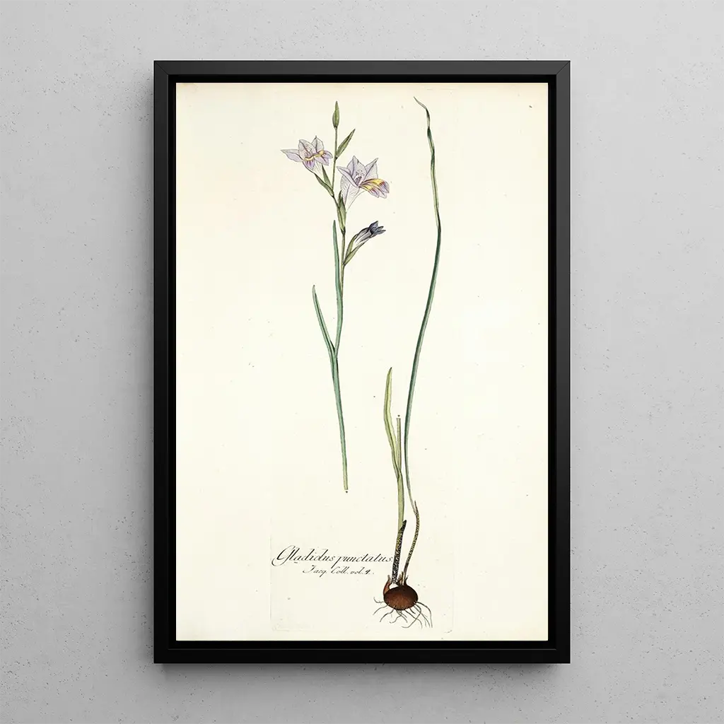 Konsttrycket Gladiolus punctatus av Nikolaus Joseph Freiherr von Jacquin utmärker sig genom sin noggranna och poetiska skildring av en delikat blomma. De livfulla nyanserna av lila och gult, kombinerat med ett subtilt ljusspel, ger liv åt detta botaniska konsttryck. Detaljernas precision, från nervaturen på blommorna till de mjuka skuggorna, skapar en atmosfär av mildhet och lugn. Varje element i kompositionen verkar fånga ett svävande ögonblick, inbjudande betraktaren att fördjupa sig i naturens flyktiga skönhet.