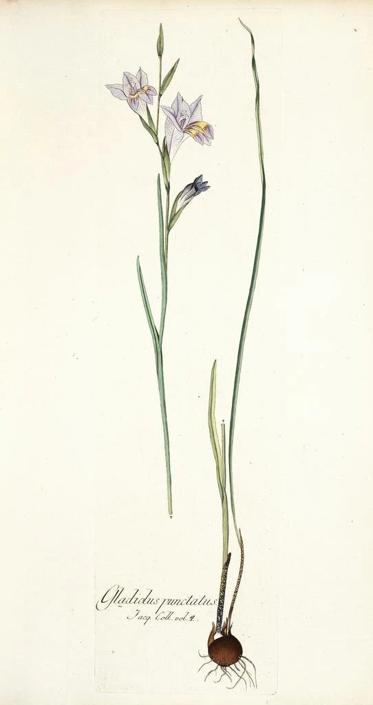 Nikolaus Joseph Freiherr von Jacquin, en framstående figur från 1700-talet, präglade sin tid med sina bidrag till botanik och konst. Som botanist utforskade han många delar av världen, samlade sällsynta växter och förevigade dem i sina verk. Hans stil, influerad av naturalismen, förenar vetenskaplig noggrannhet med konstnärlig känslighet. Gladiolus punctatus är ett perfekt exempel på hans tillvägagångssätt, där varje blomma blir ett studieobjekt och ett föremål för beundran, samtidigt som den speglar förundran inför naturen.